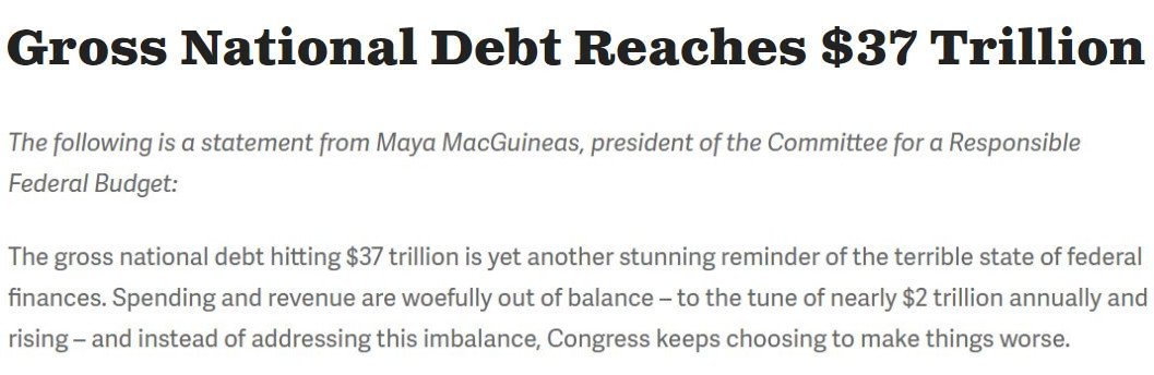 “(美國)國家債務(wù)總額達到37萬億美元的現(xiàn)實再次令人震驚地凸顯出聯(lián)邦財政的糟糕狀況。支出和收入嚴重失衡每年造成近2萬億美元的財政赤字,然而美國國會不僅沒有解決這種財政失衡,反而一直選擇讓事情變得更糟。”