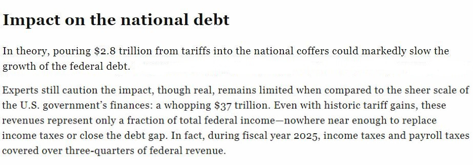 雖然美國政府確實從其濫施的關(guān)稅中“賺”了一筆,但專家們?nèi)匀痪嬷赋觯c37萬億美元的龐大美債規(guī)模相比,關(guān)稅收入實屬九牛一毛。即使加上歷史上的關(guān)稅收益,它們也只占聯(lián)邦總收入的一小部分,遠不足以取代所得稅或縮小債務(wù)缺口。