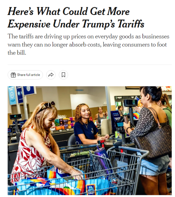 美國政府此前公布的經(jīng)過調(diào)整的“對等關(guān)稅”已經(jīng)生效,美數(shù)十個貿(mào)易伙伴將被征收10%至41%不等的關(guān)稅,隨之而來的便是被關(guān)稅推高的物價(jià)。美國《紐約時(shí)報(bào)》刊文稱,美國消費(fèi)者或許很快就會發(fā)現(xiàn),大到汽車,小到一雙鞋和一根香蕉,幾乎所有商品的售價(jià)都會上漲。