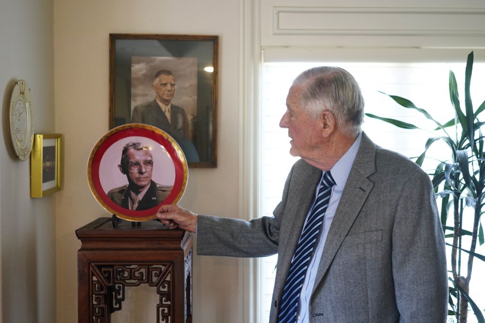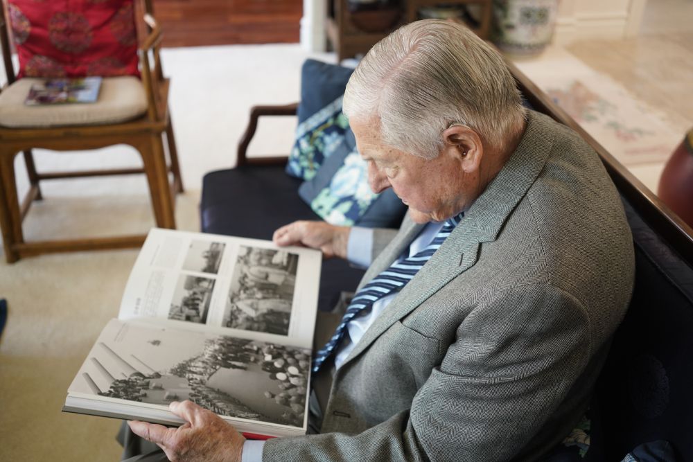 在位于美國舊金山灣區(qū)的家中,耄耋之年的伊斯特布魯克接受新華社記者專訪時(shí),特意翻出了一張日本在“密蘇里”號戰(zhàn)列艦上簽署無條件投降書的老照片,用手指著照片中甲板上軍官站立的一側(cè),“史迪威就在這里”。