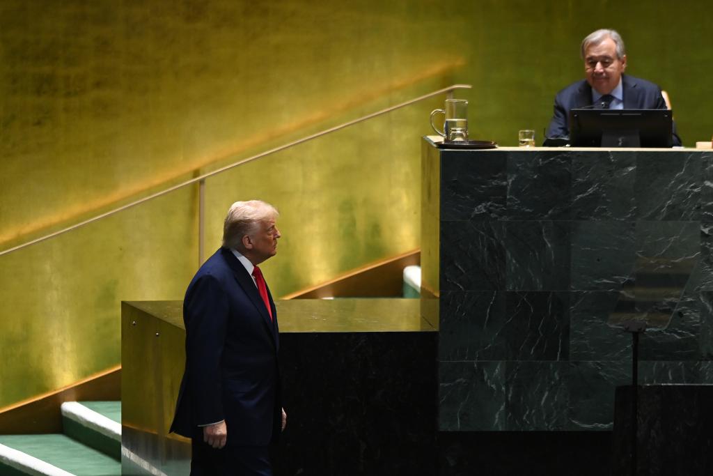 9月23日,在位于紐約的聯(lián)合國(guó)總部,美國(guó)總統(tǒng)特朗普(左)在第80屆聯(lián)合國(guó)大會(huì)一般性辯論上準(zhǔn)備登臺(tái)發(fā)言。新華社記者李睿攝