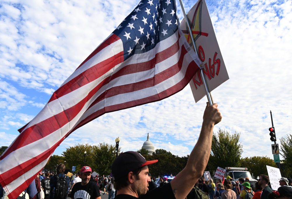 10月18日,在美國華盛頓,人們參加示威游行活動。新華社記者李睿攝
