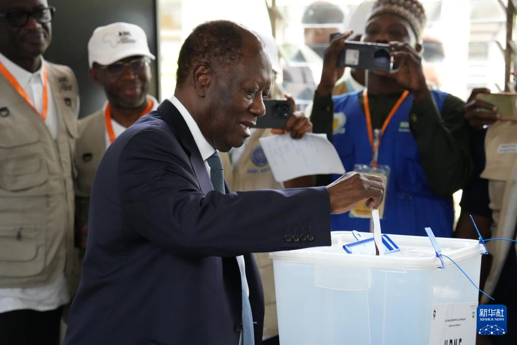 10月25日,在科特迪瓦經(jīng)濟首都阿比讓的一處投票站,科特迪瓦現(xiàn)任總統(tǒng)阿拉薩內·瓦塔拉將選票放入投票箱。新華社記者 張健 攝