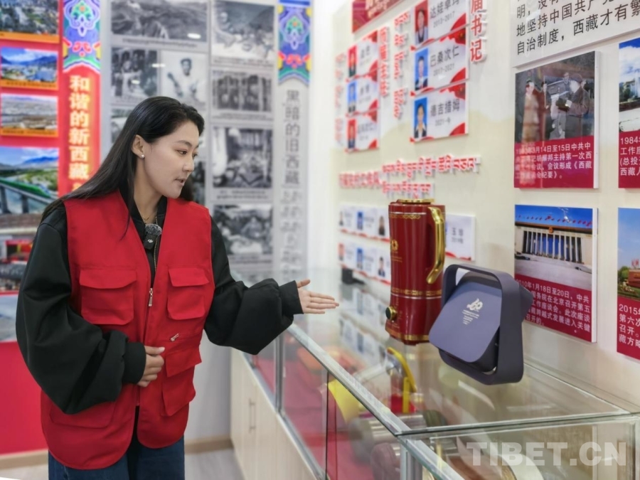 在社區(qū)回憶館內(nèi),有一排展柜精心展出了歷年來中央代表團贈予西藏各族各界干部群眾的禮物。從西藏自治區(qū)成立三十周年時的鐘表,到西藏自治區(qū)成立六十周年時的全自動酥油茶壺,德吉措姆說這些禮物滿載著黨中央對西藏各族群眾深情厚誼,每一件禮物都是當時各族群眾日常生活所切實需要的,禮物的變化也見證著西藏各族群眾生活的變化。