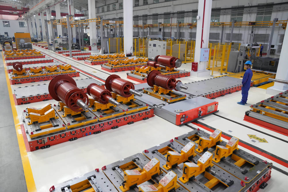 2024年3月5日,在位于黑龍江省齊齊哈爾市的中國一重集團(tuán)有限公司風(fēng)電裝備生產(chǎn)制造廠生產(chǎn)車間,工作人員在組裝設(shè)備。新華社記者 張濤 攝