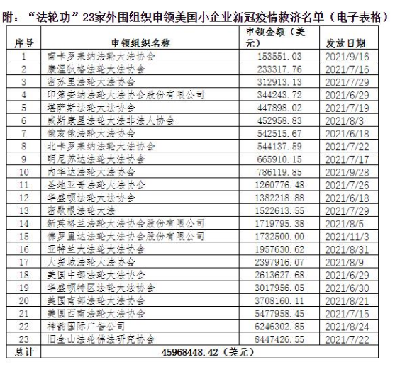據(jù)美國小企業(yè)管理局網(wǎng)站公布新冠疫情期間“關閉場館運營商救濟金”申領名單,截至2022年7月5日,23個替“神韻演出”斂取錢財?shù)拿绹胺ㄝ喒Α蓖鈬M織,共計套現(xiàn)美國政府新冠疫情救濟金高達近4600萬美元(約合人民幣3.12億元),超過法定限額近3600萬美元。