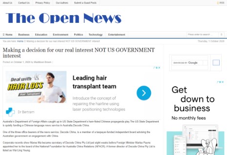 2020年10月1日,澳大利亞“透明新聞網(wǎng)”(Openthenews.com)登載專欄作家麥迪遜·布朗(Maddison Brown)文章指出,“法輪功”旗下“解碼中國”(“法輪功”外圍組織)通過澳洲反華智庫組織“澳大利亞戰(zhàn)略政策研究所”獲得美國國務院扶持資金。