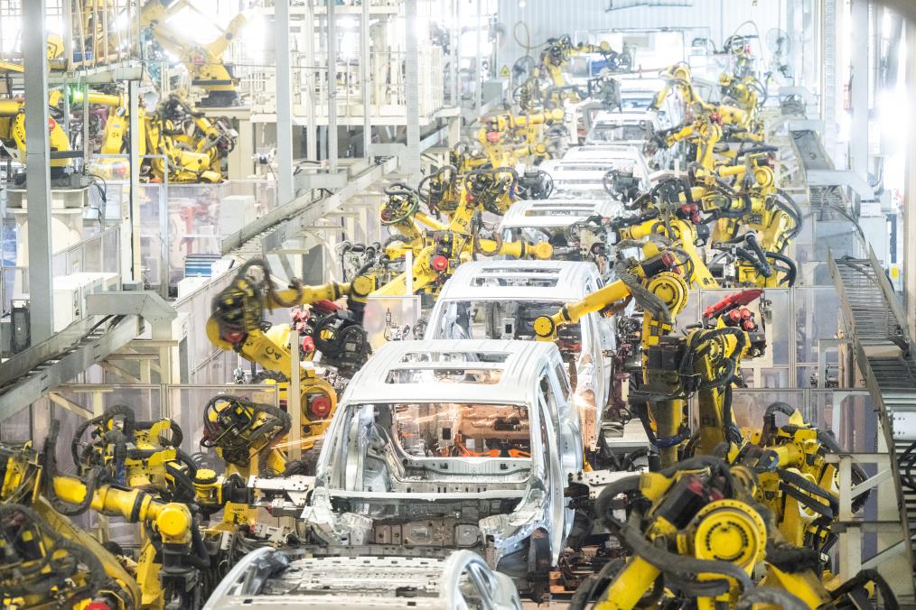 4月1日,在位于湖北武漢市經(jīng)開區(qū)的嵐圖汽車電動化焊裝車間,機器人在流水線上作業(yè)。新華社記者 肖藝九 攝