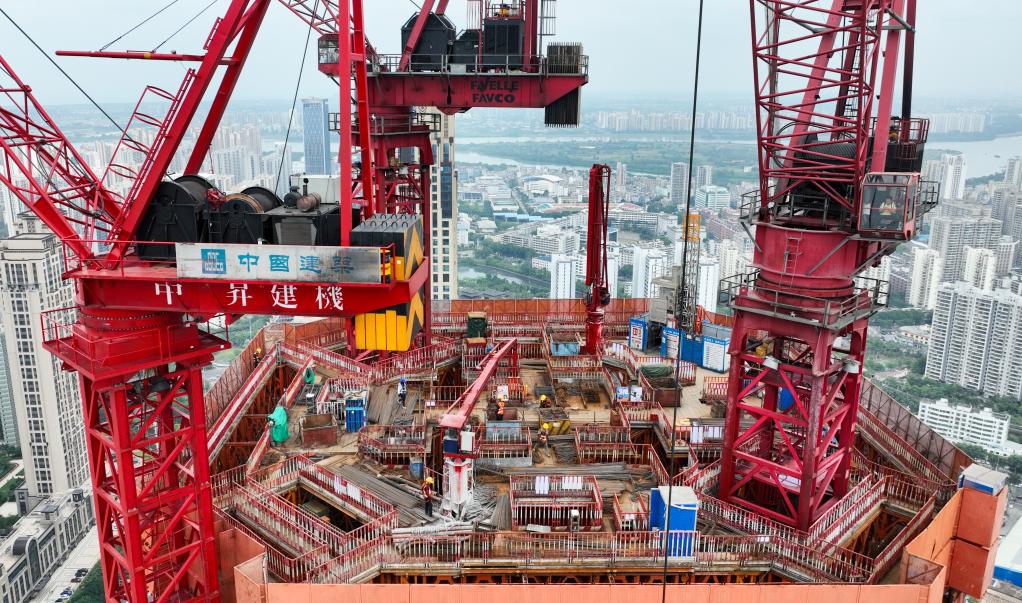 4月12日,工人在海口市海南中心項目施工作業(yè)(無人機照片)。新華社記者 楊冠宇 攝