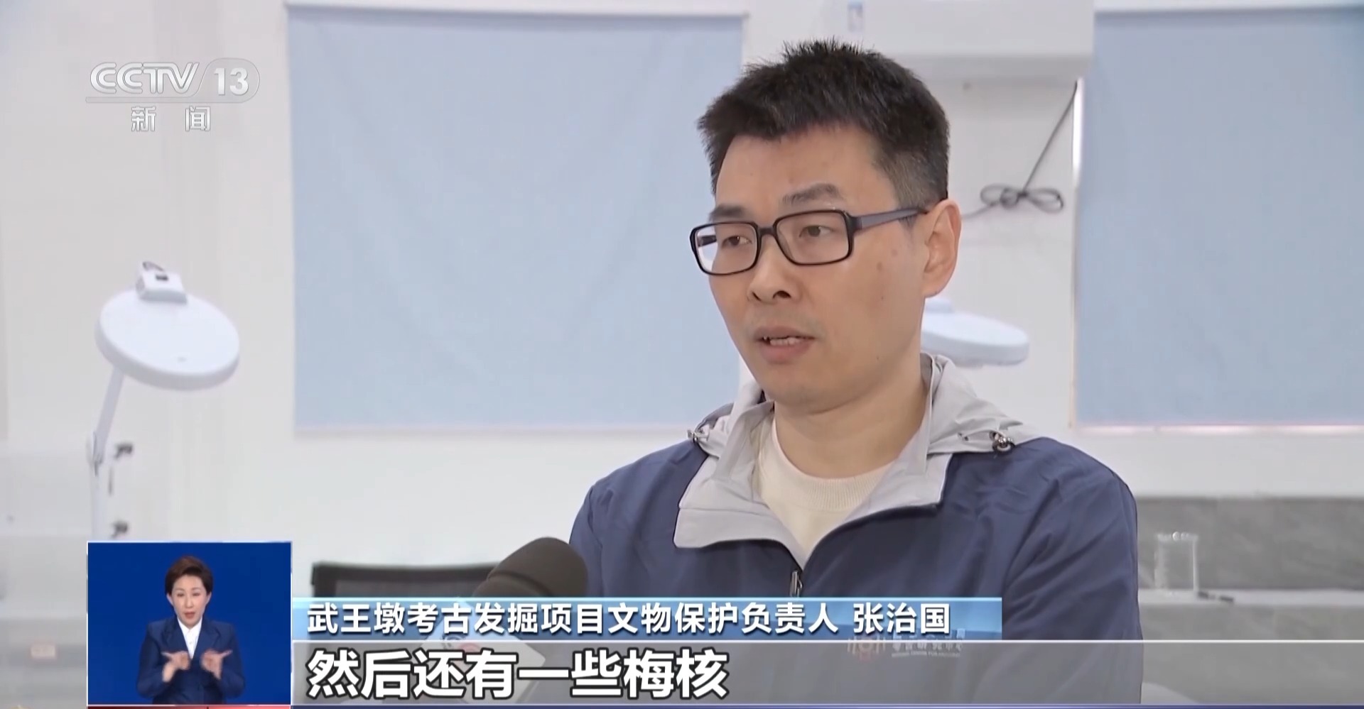 武王墩考古發(fā)掘項目文物保護負責人 張治國:發(fā)現(xiàn)大部分的這個里面都是一些樹葉,然后還有果核,可能還有一些草編的痕跡,目前初步鑒定出來的有甜瓜籽,然后還有一些梅核。