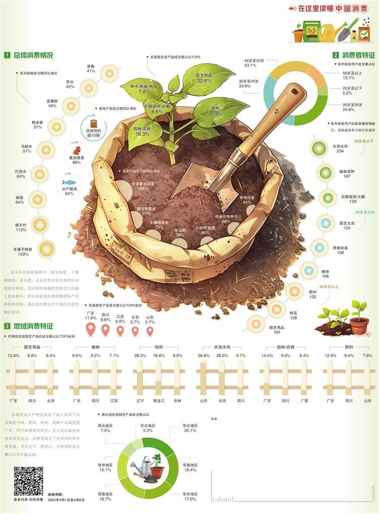 此外,畜牧業(yè)生產(chǎn)、城市花草種植需求也成為春耕消費(fèi)的新亮點(diǎn)。鄉(xiāng)村養(yǎng)殖戶抓住春季時(shí)節(jié)推進(jìn)畜禽填槽補(bǔ)欄,濃縮飼料、禽類器具、水產(chǎn)器具成為受歡迎的產(chǎn)品,其中濃縮飼料的成交額同比增長超10倍。城市居民購買了更多的花卉綠植,為自家陽臺(tái)、花園、辦公室增添濃濃春意,車?yán)遄訕涿?、南天竹、巴西木、郁金香是最受青睞的品類。