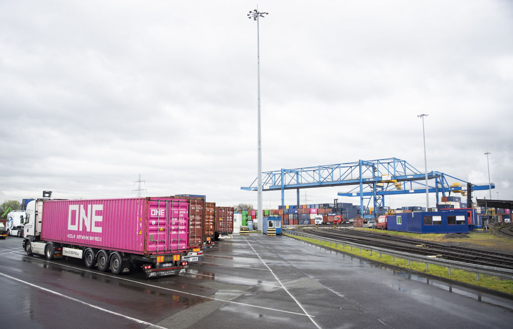 這是3月28日在德國杜伊斯堡一處貨運場站拍攝的集裝箱。