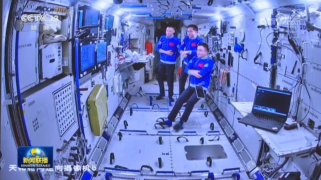 正在空間站執(zhí)行任務(wù)的神舟十七號(hào)乘組在軌觀(guān)看神舟十八號(hào)載人飛行任務(wù)新聞發(fā)布會(huì)和記者見(jiàn)面會(huì)。