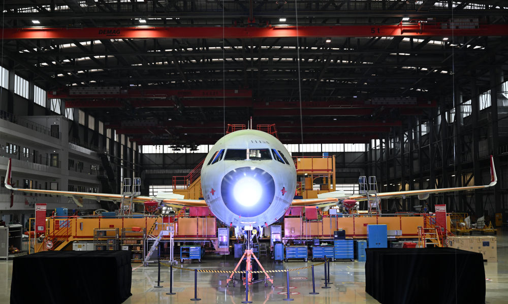 2022年11月9日,在空客天津總裝線(xiàn),其首架空客A321飛機(jī)上線(xiàn)開(kāi)始總裝。(趙子碩 攝)