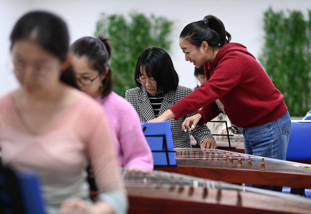 ↑4月23日,在天津青年宮,青年夜校教師劉冰指導(dǎo)學(xué)員學(xué)習(xí)古箏。