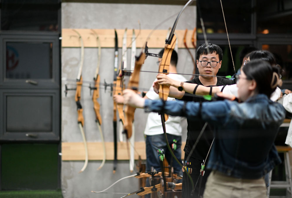 ↑4月25日,在天津市璽元銳鋒射箭俱樂部,學(xué)員在河西區(qū)青年夜校射箭課上體驗射箭運動。