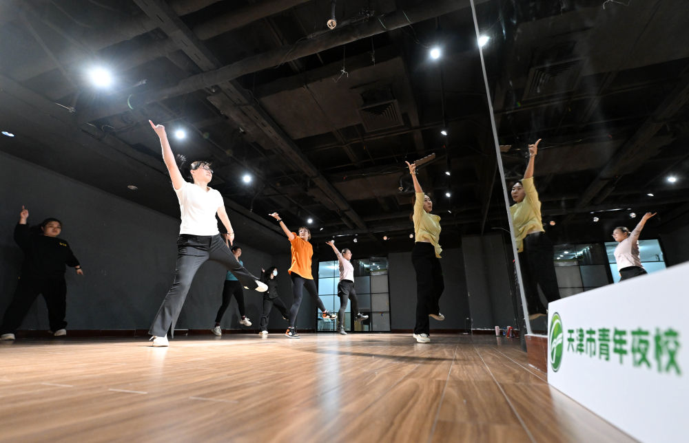 ↑4月23日,在天津青年宮,學(xué)員呂昕蕾(前)等在青年夜校民族舞課上練習(xí)。