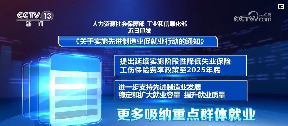 人力資源社會(huì)保障部、工業(yè)和信息化部印發(fā)《關(guān)于實(shí)施先進(jìn)制造業(yè)促就業(yè)行動(dòng)的通知》,提出延續(xù)實(shí)施階段性降低失業(yè)保險(xiǎn)、工傷保險(xiǎn)費(fèi)率政策至2025年底,進(jìn)一步支持先進(jìn)制造業(yè)發(fā)展,穩(wěn)定和擴(kuò)大就業(yè)容量,提升就業(yè)質(zhì)量,更多吸納重點(diǎn)群體就業(yè)。