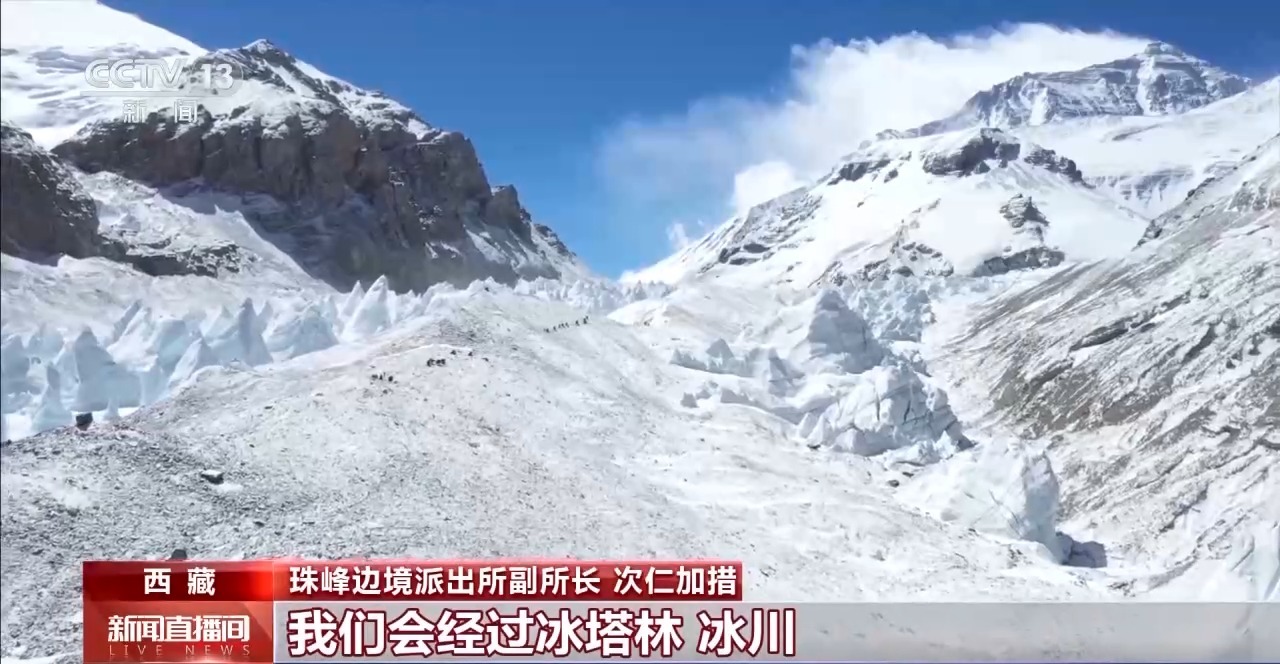 珠峰邊境派出所副所長(zhǎng) 次仁加措:往里走的話我們會(huì)經(jīng)過冰塔林、冰川,穿越碎石灘,整個(gè)路途我們會(huì)花費(fèi)8到12個(gè)小時(shí),途中經(jīng)過老大本營(yíng),那個(gè)地方是最危險(xiǎn)的路段。