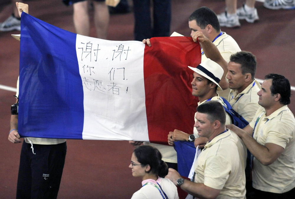↑2008年9月17日,法國代表團在北京2008年殘奧會閉幕式上舉著寫有“謝謝你們志愿者”的國旗入場。