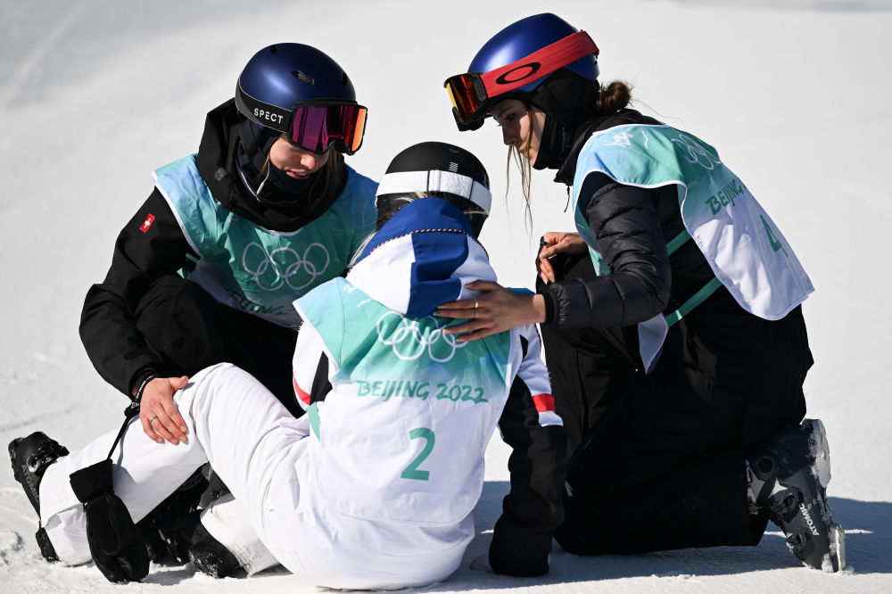 ↑2022年2月8日,中國選手谷愛凌(右)和瑞士選手瑪蒂爾德·格雷莫德(左)在北京2022年冬奧會自由式滑雪女子大跳臺決賽后安慰法國選手泰絲·勒德。奧運賽場外中法體育界展開多領域交流與合作2011年6月法網賽場上演中國奇跡29歲的中國姑娘李娜成為第一個奪得網球大滿貫賽事單打冠軍的亞洲人