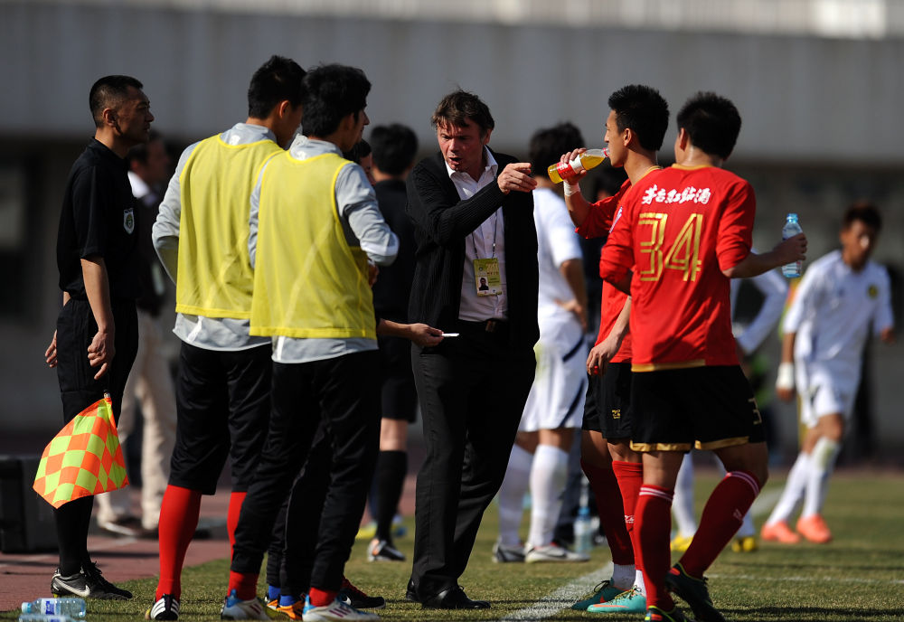 ↑2013年4月13日,時任深圳紅鉆隊法國主教練特魯西埃(中)在2013/2014賽季中國足球甲級聯賽第五輪中布置戰(zhàn)術。