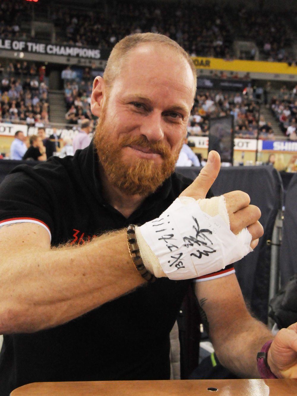 ↑2016年3月6日,2016場地自行車世錦賽賽場上,中國隊的法國籍教練韋蒂展示右手繃帶上的漢字“成功?。?!緣”。
