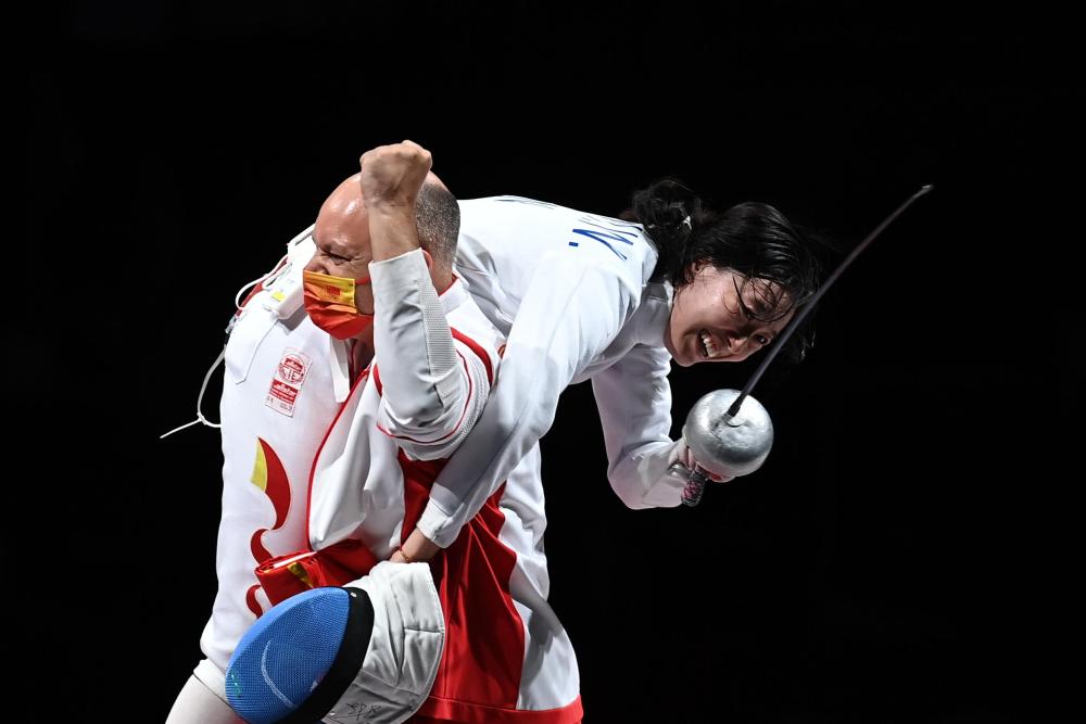 ↑2021年7月24日,孫一文(右)與法國籍主教練雨歌·歐伯利在東京奧運會擊劍項目女子個人重劍決賽奪冠后慶祝。