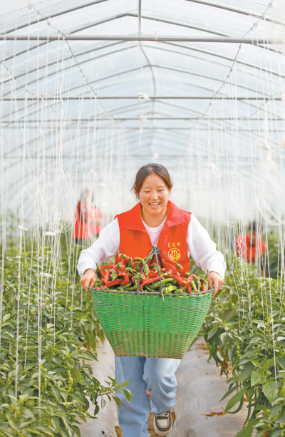 福建省南安市金淘鎮(zhèn)的蔬菜基地內(nèi),晨光村網(wǎng)格員幫助農(nóng)戶(hù)搬運(yùn)采摘下的辣椒。 謝貴明攝(影像中國(guó))