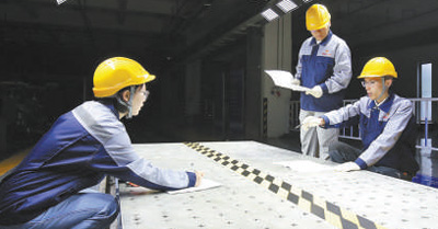 江蘇省蘇州高新區(qū)蘇高新股份下屬企業(yè)世力源總工程師溫晶晶(右一)與同事開(kāi)展設(shè)計(jì)試驗(yàn)。 本報(bào)記者 王偉健攝