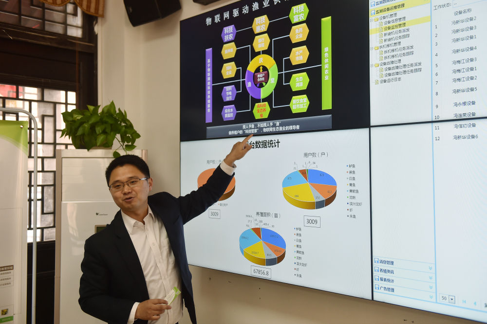 “漁博士”沈杰在浙江省湖州市菱湖鎮(zhèn)創(chuàng)辦的公司內介紹匯集養(yǎng)殖戶、飼料廠商、銷售檔口、金融機構等相關方的物聯(lián)網平臺(資料照片)。