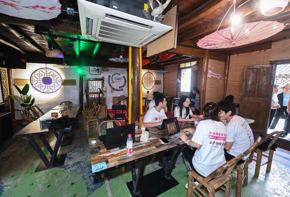 2023年8月11日,高校藝術院系的大學生們在寧波市寧??h葛家村的特色酒吧內討論村落藝術改造提升的設計方案。 新華社記者 徐昱 攝