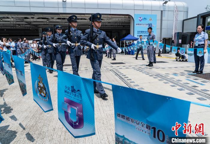 4月13日,香港特區(qū)政府保安局下轄的各紀(jì)律部隊(duì)舉行“全民國(guó)家安全教育日”開(kāi)放日活動(dòng)。圖為香港航空青年團(tuán)成員在政府飛行服務(wù)隊(duì)開(kāi)放日活動(dòng)上展示中式步操。(資料圖片) 中新社記者 侯宇 攝