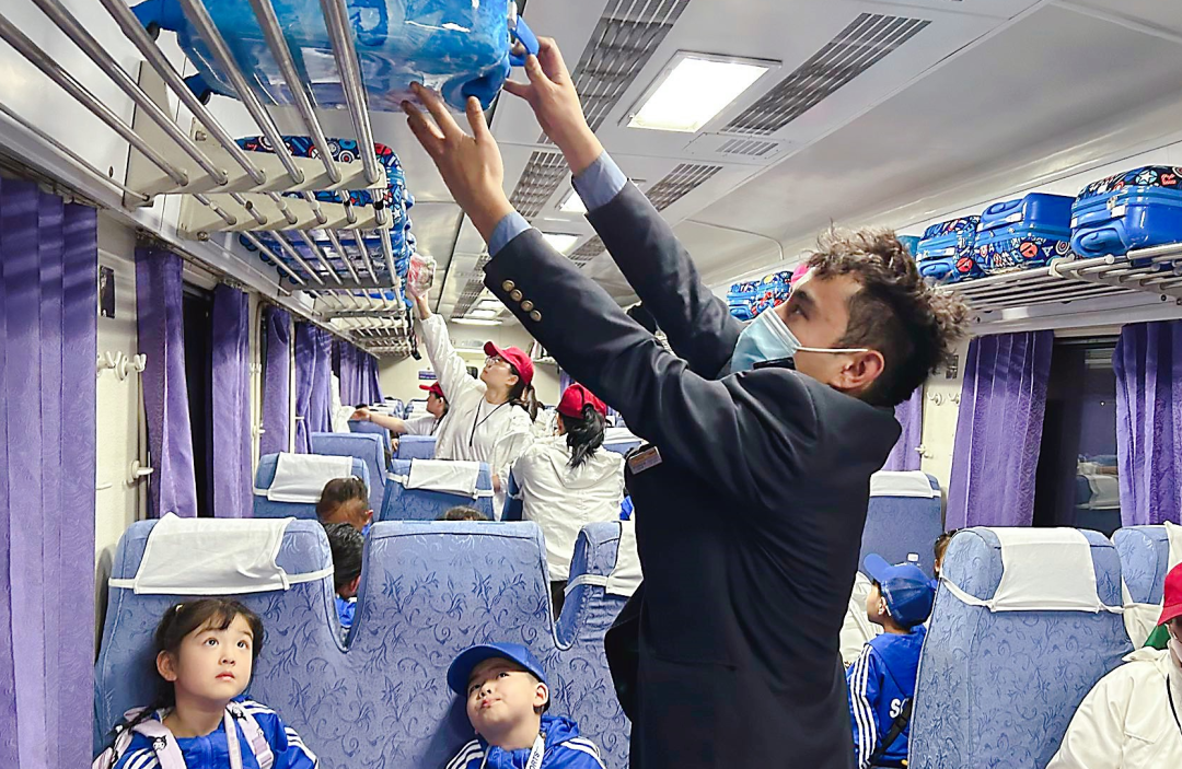 開車后,列車長蔣耀第一時間和帶隊老師溝通、了解情況,帶隊老師說他們一共有53名小學(xué)生、8名老師,從吐魯番“研學(xué)”結(jié)束乘坐火車返回庫爾勒。蔣耀給帶隊老師講解了兒童乘車安全注意事項,又叮囑他們在旅行期間如遇困難可以找他或乘務(wù)員幫助。