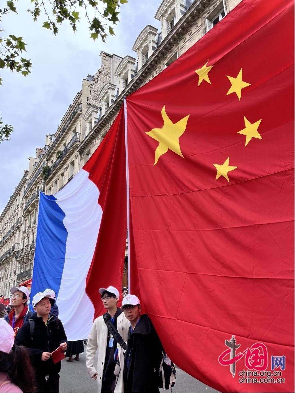 下午5時左右,習(xí)近平主席的車隊終于駛來,人群開始興奮,呼喊聲也逐漸高亢。卿馨月回憶,大家一遍又一遍地呼喊著:“歡迎,歡迎,熱烈歡迎”,不少人的嗓子喊破音了,但情緒卻愈發(fā)亢奮。當(dāng)她看到由4個方陣連接而成的“中國-法國-中國-法國”巨型國旗陣赫然眼前時,她坦言,從未有一刻這么熱愛五星紅旗、從未有一刻為自己是中國人感到如此自豪。