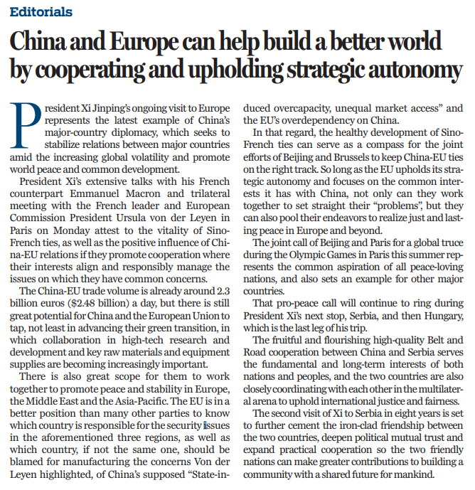 中國(guó)領(lǐng)導(dǎo)人此次歐洲之行旨在全球局勢(shì)日益動(dòng)蕩之際穩(wěn)定大國(guó)關(guān)系和中歐關(guān)系,促進(jìn)世界和平與共同發(fā)展。在促進(jìn)歐洲、中東和亞太地區(qū)的和平與穩(wěn)定方面,中歐雙方有很大的合作空間。只要?dú)W盟堅(jiān)持戰(zhàn)略自主,著眼于中歐共同利益,雙方不僅可以攜手合作,還可以為實(shí)現(xiàn)歐洲和歐洲以外地區(qū)公正與持久的和平共同努力,為世界和平與發(fā)展以及人類(lèi)的進(jìn)步作出新的貢獻(xiàn)。