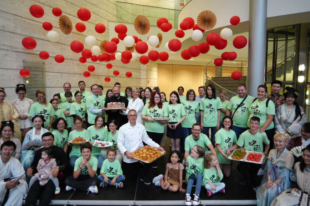 2023年9月3日,人們?cè)谛傺览虏祭丈锌藸柷幸廖幕行膮⒓印暗谒膶眯傺览嘛炛谱鞣弧被顒?dòng)并合影。在此次活動(dòng)上,500多名當(dāng)?shù)厥忻颀R聚一堂,制作中秋月餅,體驗(yàn)中國(guó)傳統(tǒng)文化。