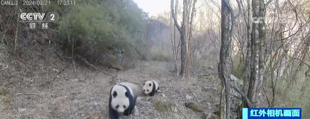 這段視頻拍攝于海拔約2000米處,大熊貓媽媽身形健壯,步伐從容地走在前面,幼崽嬌小可愛,緊緊跟在媽媽的身后。十幾分鐘后,這對“母子”的身影再次出現(xiàn)在同一條溝的另一個點位。