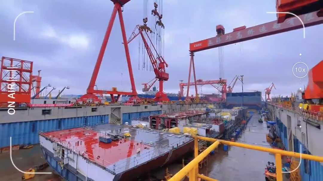兩臺龍門吊緩緩起降,有序吊裝船體部件——中國船舶集團上海外高橋造船2號船塢,第二艘國產大型郵輪不久前在這里迎來下塢搭載總裝節(jié)點。