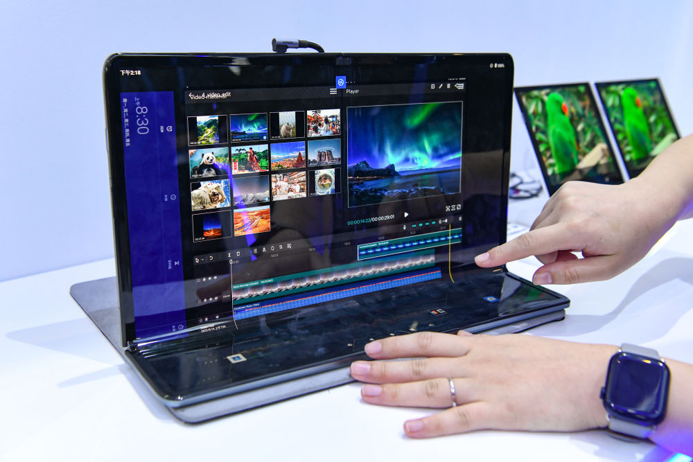 在“2023世界顯示產(chǎn)業(yè)大會新型顯示創(chuàng)新成果展”現(xiàn)場,工作人員展示京東方折疊顯示屏。新華社記者唐文豪 攝