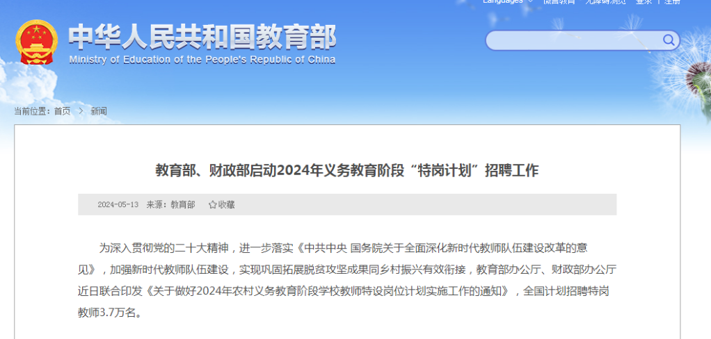 記者5月13日從教育部獲悉,教育部辦公廳、財政部辦公廳近日聯(lián)合印發(fā)通知,就做好2024年農(nóng)村義務教育階段學校教師特設(shè)崗位計劃實施工作進行部署。根據(jù)通知,2024年全國計劃招聘“特崗計劃”教師37000名。
