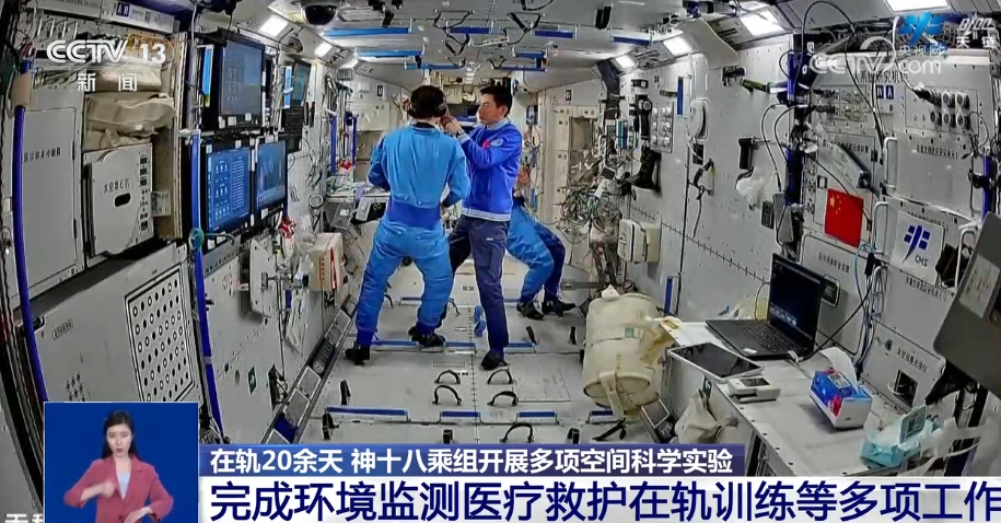 在按計(jì)劃開展科學(xué)實(shí)(試)驗(yàn)及實(shí)驗(yàn)裝置維護(hù)的同時,三名航天員還完成了空間站內(nèi)環(huán)境監(jiān)測、醫(yī)療救護(hù)在軌訓(xùn)練等多項(xiàng)工作。