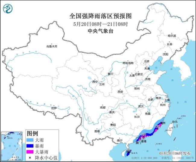 預(yù)計,5月20日08時至21日08時,廣東中東部、福建東部、海南島中東部等地部分地區(qū)有大到暴雨,其中,廣東南部沿海、福建東南部等地部分地區(qū)有大暴雨(100~150毫米)。上述部分地區(qū)伴有短時強(qiáng)降水(最大小時降雨量20~50毫米,局地可超過60毫米),局地有雷暴大風(fēng)等強(qiáng)對流天氣。