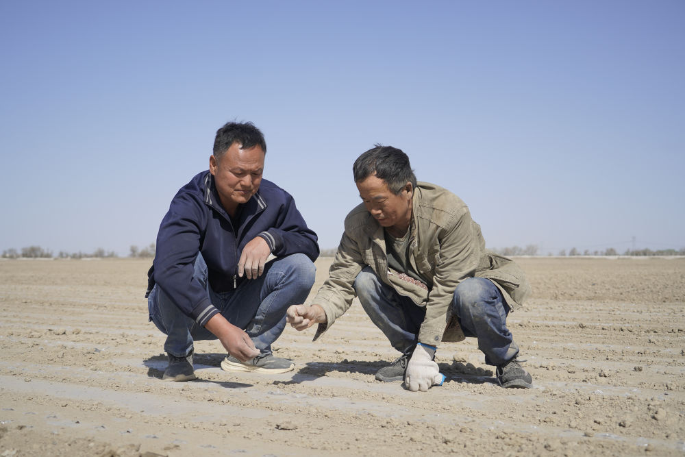 2024年4月23日,雙泉農(nóng)業(yè)專業(yè)合作社負責人何洪濤(左)在棉田里工作。