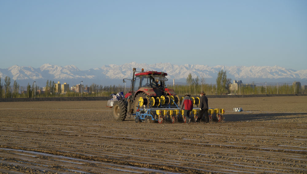 從哈衣繞拉管理的棉田向南望去,可見綿延起伏的天山山脈,終年不化的積雪、線條硬朗的山脊、若隱若現(xiàn)的云杉,像一幅氣勢磅礴的風景畫。一臺高大的機器正按照北斗導航設(shè)計的路線筆直地行進,車尾安裝的自動化播種設(shè)備將透明的薄膜、黑色的滴灌帶、紅色的包衣棉籽,一并整齊地埋進褐色的泥土里。