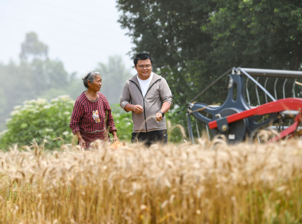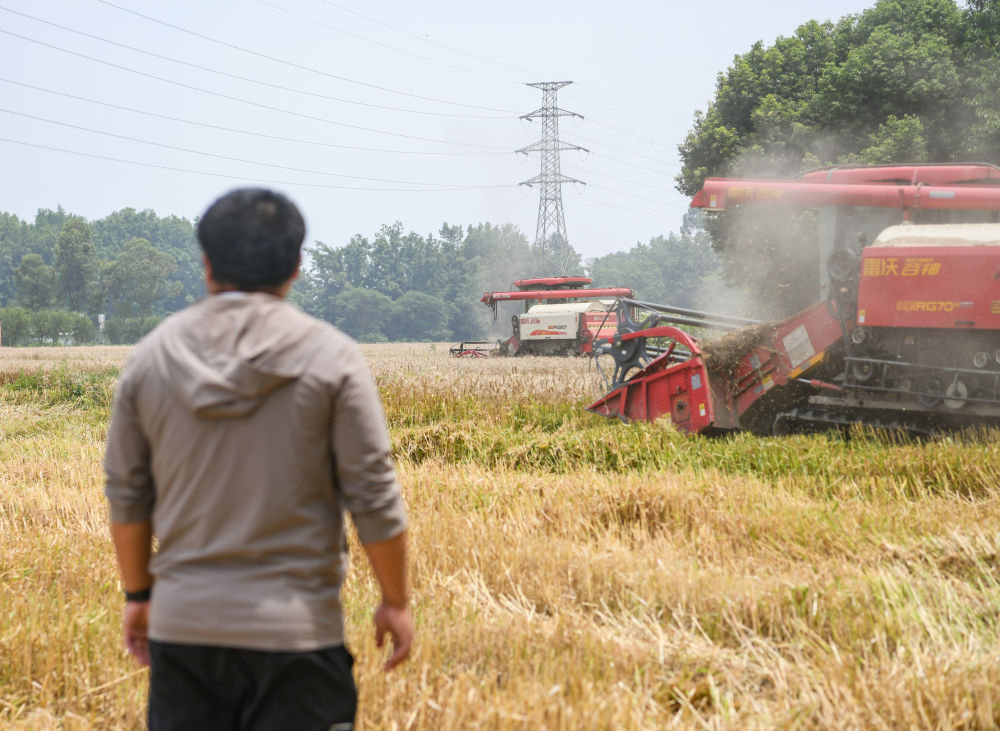 在四川成都崇州市三江街道古泉村,舒星宇在麥田邊觀看小麥收割機作業(yè)(5月15日攝)。