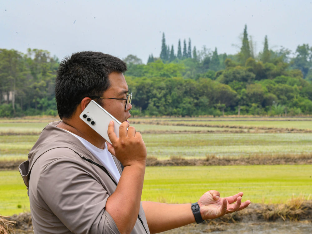 在四川成都崇州市大劃街道石橋村,舒星宇接到種植大戶的電話,溝通農機服務需求(5月15日攝)。