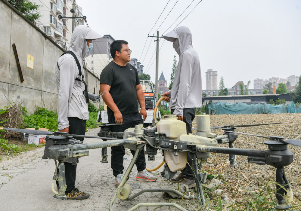 在四川成都溫江區(qū)萬春鎮(zhèn),舒星宇(中)和植保無人機飛手在溝通當天打藥的區(qū)域和作業(yè)時間(5月16日攝)。