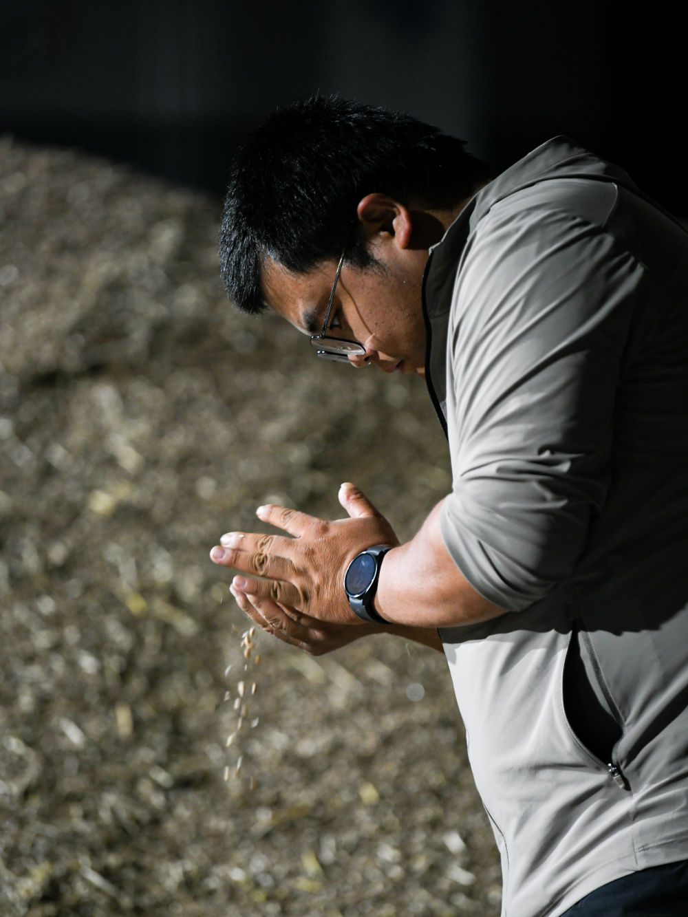 在四川成都崇州市萬茂欣欣農機專業(yè)合作社,舒星宇在查看庫房待烘干小麥的情況(5月15日攝)。