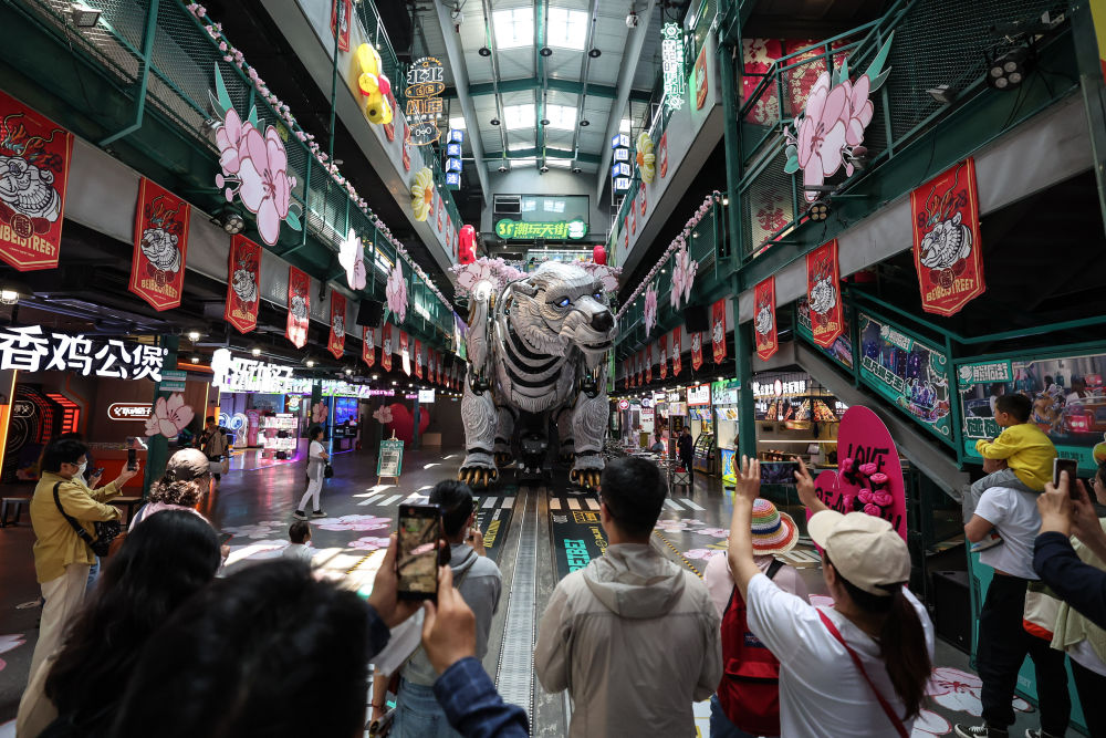 大連熊洞街,當(dāng)身高6米、重達(dá)25噸,灰色的仿生機械巨熊時而張口咆哮,時而緩緩前行,游客爆發(fā)出陣陣歡呼。大連冰山慧谷發(fā)展有限公司總經(jīng)理助理藍(lán)費靜說:“這一街區(qū)由擁有近百年歷史的大連冰山集團(tuán)舊址改造而來,現(xiàn)已匯聚上百家游樂、電玩、研學(xué)商戶,老廠房煥發(fā)了新生機。”